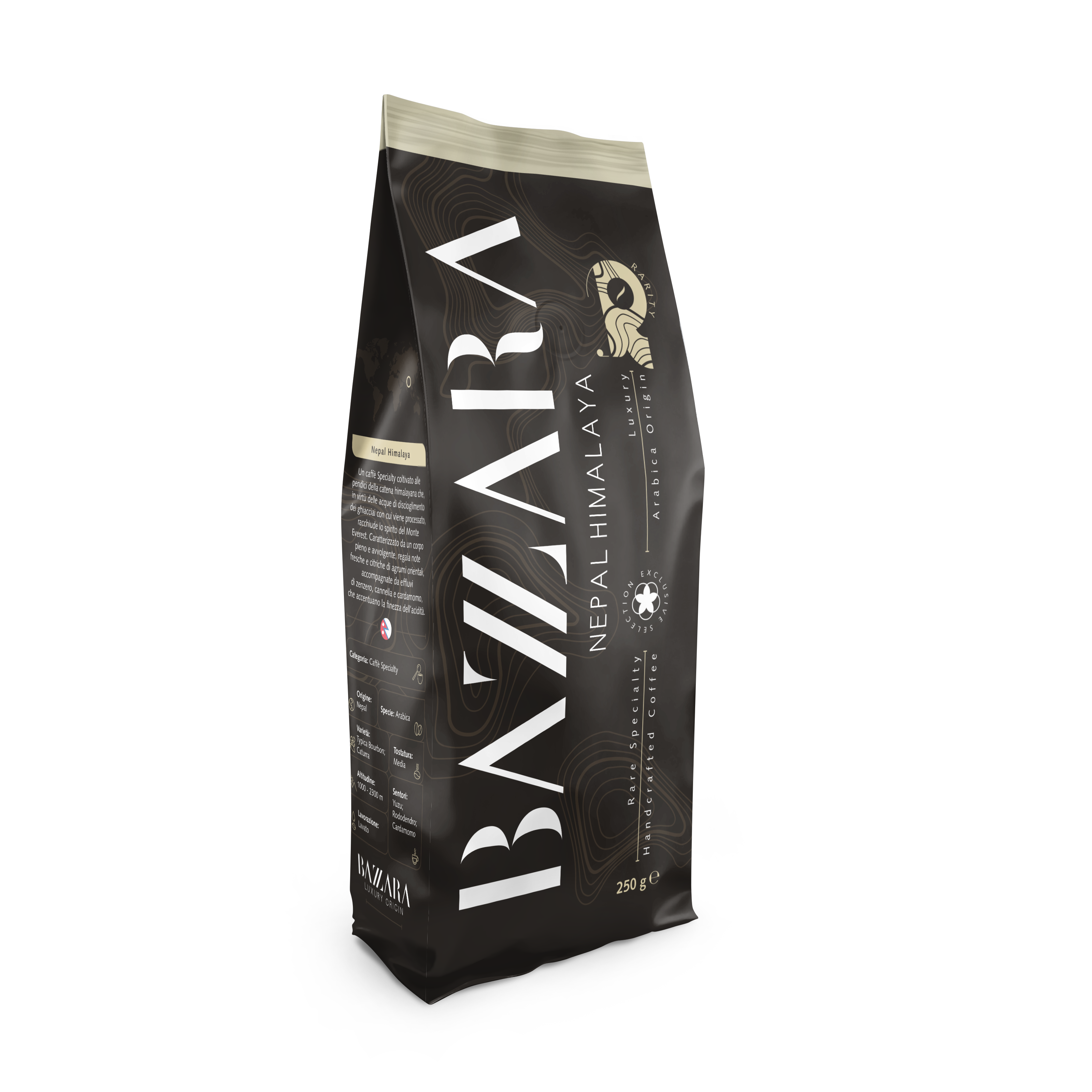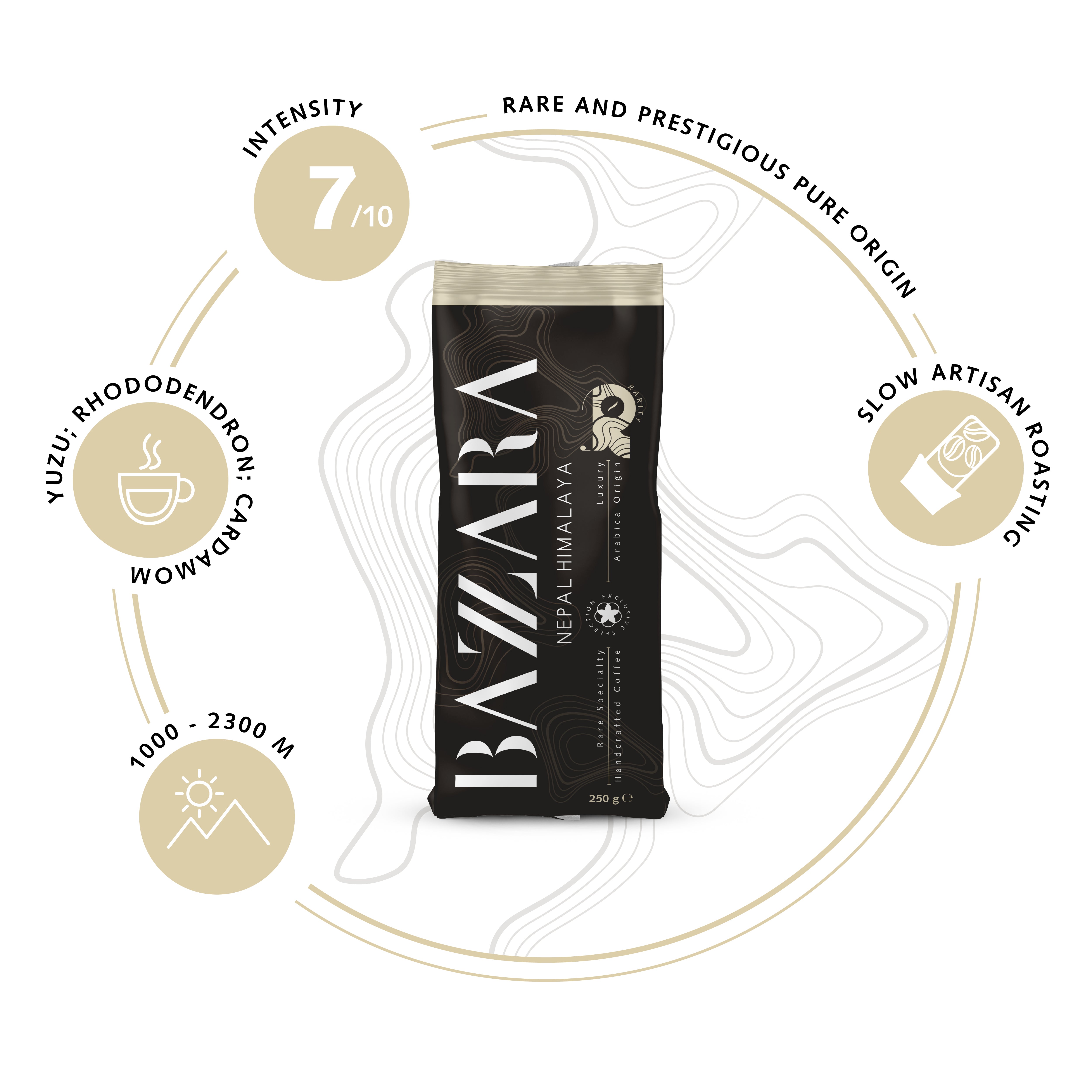 Ontdek de buitengewone Bazzara Rarity Luxury Origin Nepal Himalaya koffiebonen, afkomstig uit een van de hoogst groeiende regio's ter wereld. Deze exclusieve koffie is perfect voor fijnproevers die op zoek zijn naar een uitzonderlijke smaakbeleving bij elke kop.